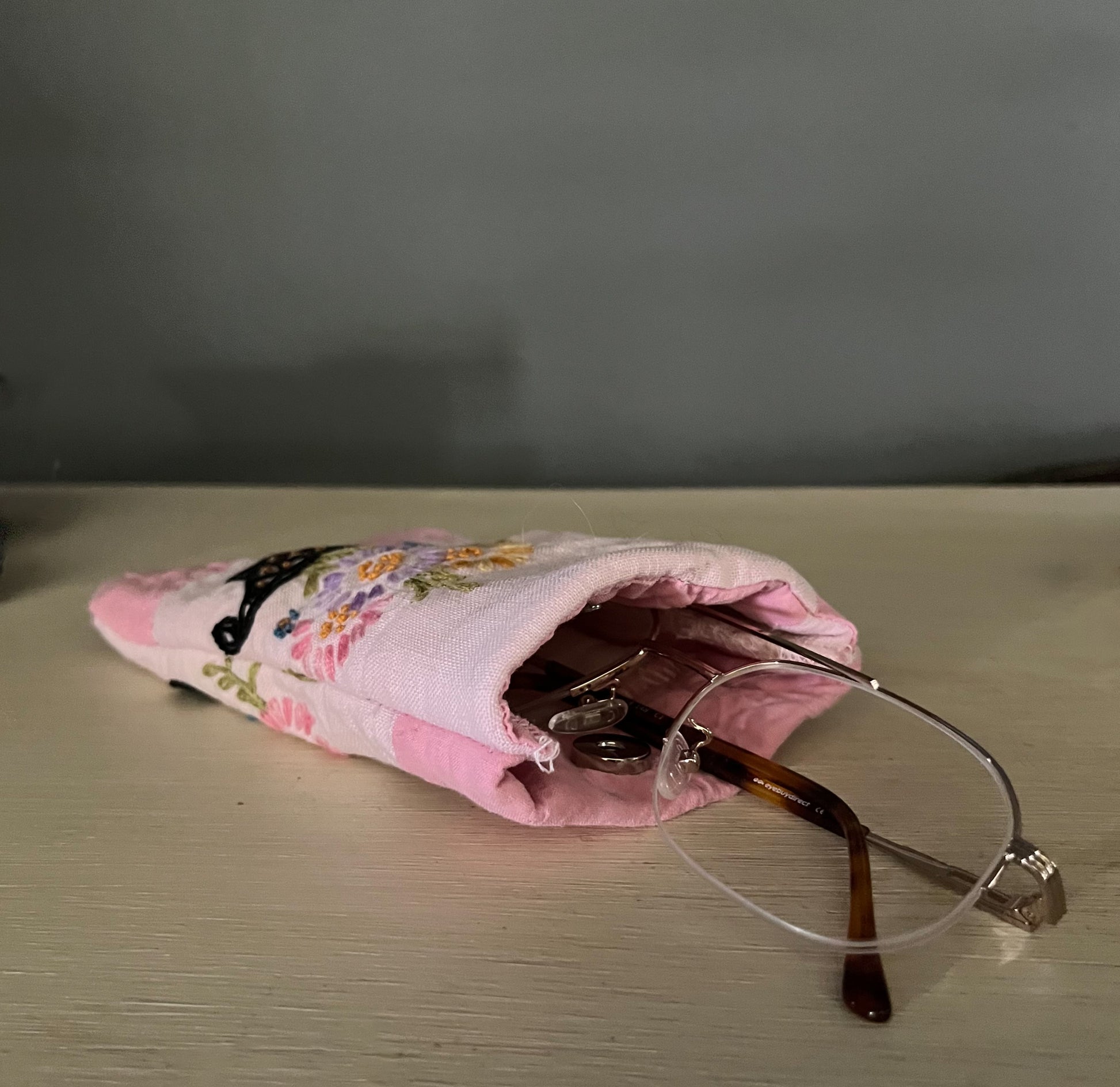 This vintage quilt glasses pouch is a handmade, one of a kind piece that not only holds your glasses, but also protects them from scratches. With its unique design, your glasses will never go unnoticed, and will bring a smile to your face.
