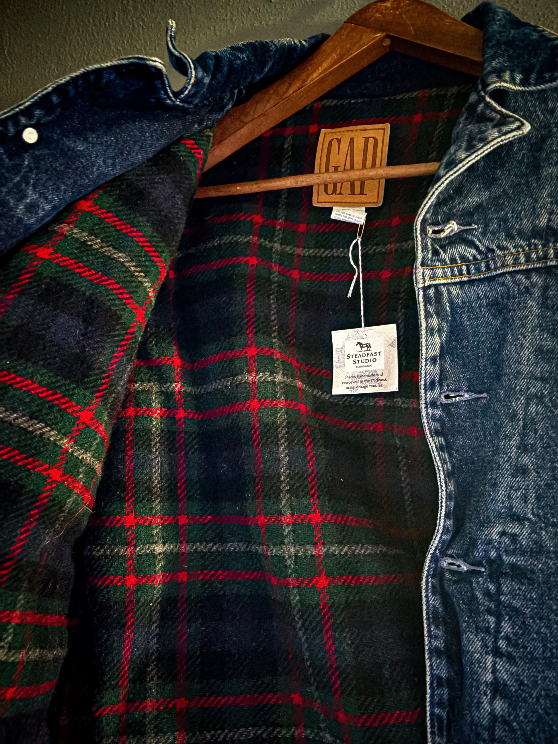 This reclaimed Gap denim jacket features a unique quilt pieced design, adding a touch of originality to your style. It offers a distressed look for an effortlessly cool vibe.
