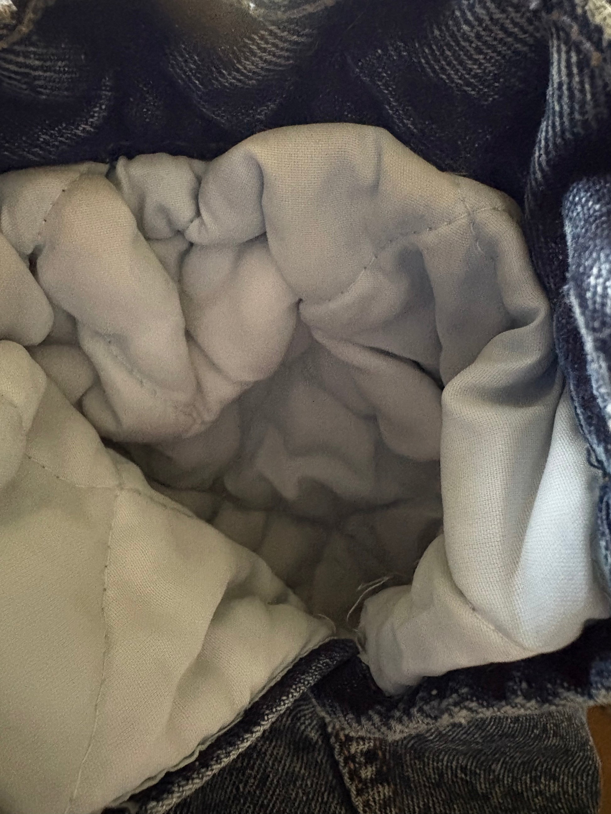 It has its original lining of a plaid fabric and the sleeves are in a silky feeling quilted fabric.