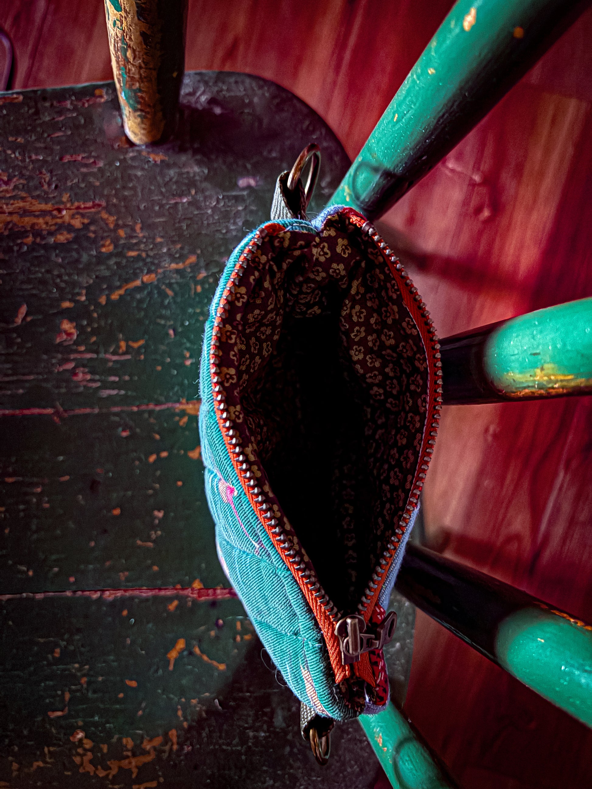 This is a tiny pouch that can be used by itself (just add a strap) or attached to another bag, or thrown into a bag. Use it for change, credit cards, keys, make up etc.