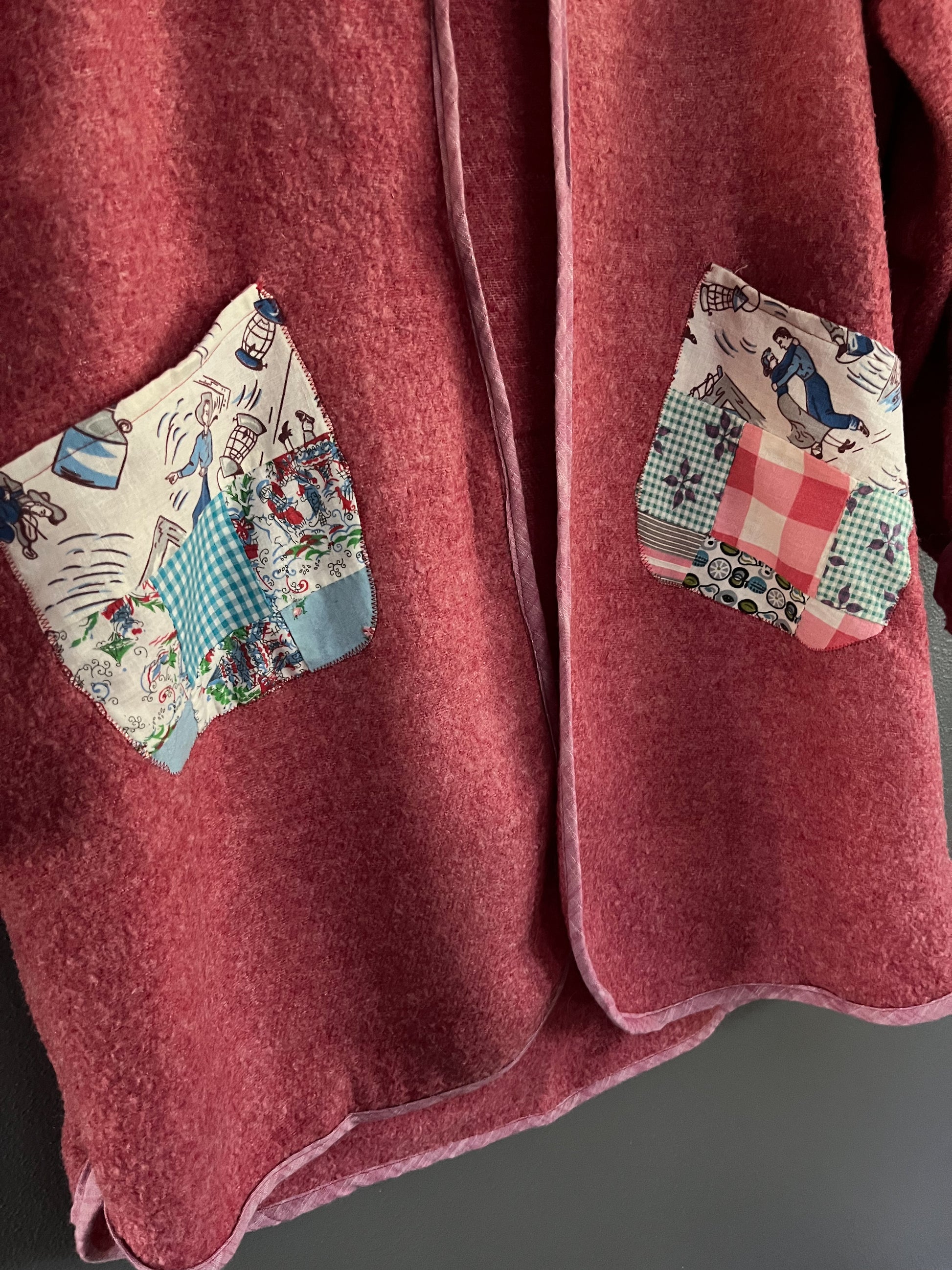 This one-of-a-kind Greta Jacket is made from a vintage blanket and parts of an old quilt perfect to wear as a light jacket or an all day cozy piece. There may be in slight imperfections as vintage pieces often have, making each piece truly unique. Elevate your wardrobe with this exclusive statement piece.