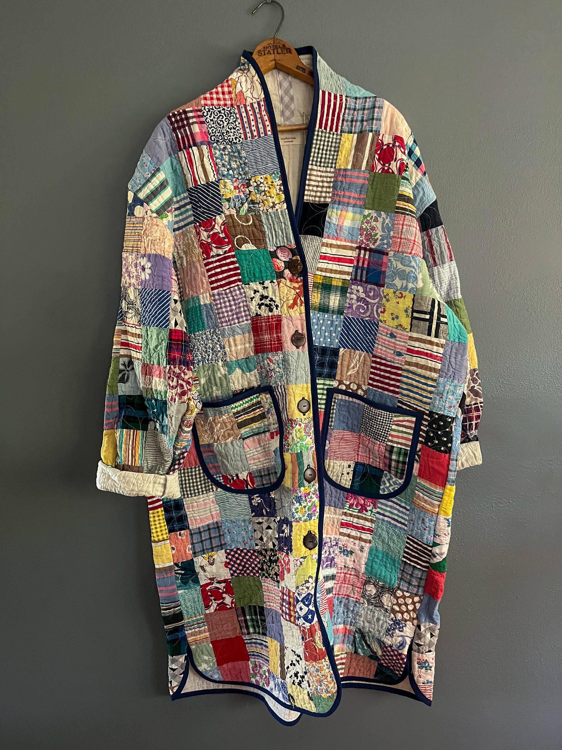 This one-of-a-kind Patchwork Greta is a truly one of a kind fun mix of patterns. There may be in slight imperfections as vintage pieces often have, making each piece truly unique. Elevate your wardrobe with this exclusive statement piece.